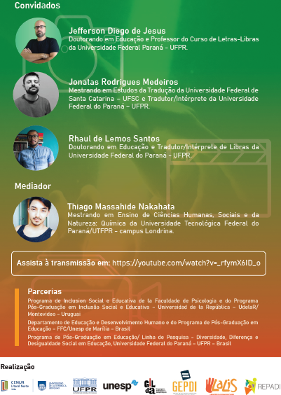 A atividade – gratuita e acessível em Libras, com duração prevista de duas horas – será ministrada por três docentes: Sueli Fernandes, professora do curso de Letras Libras da UFPR; professor Leonardo Peluso, da Faculdade de Psicologia da Universidad de la República (Udelar); e Sandra Eli Martins, professora do Departamento de Educação e Desenvolvimento Humano da Universidade Estadual Paulista (Unesp).