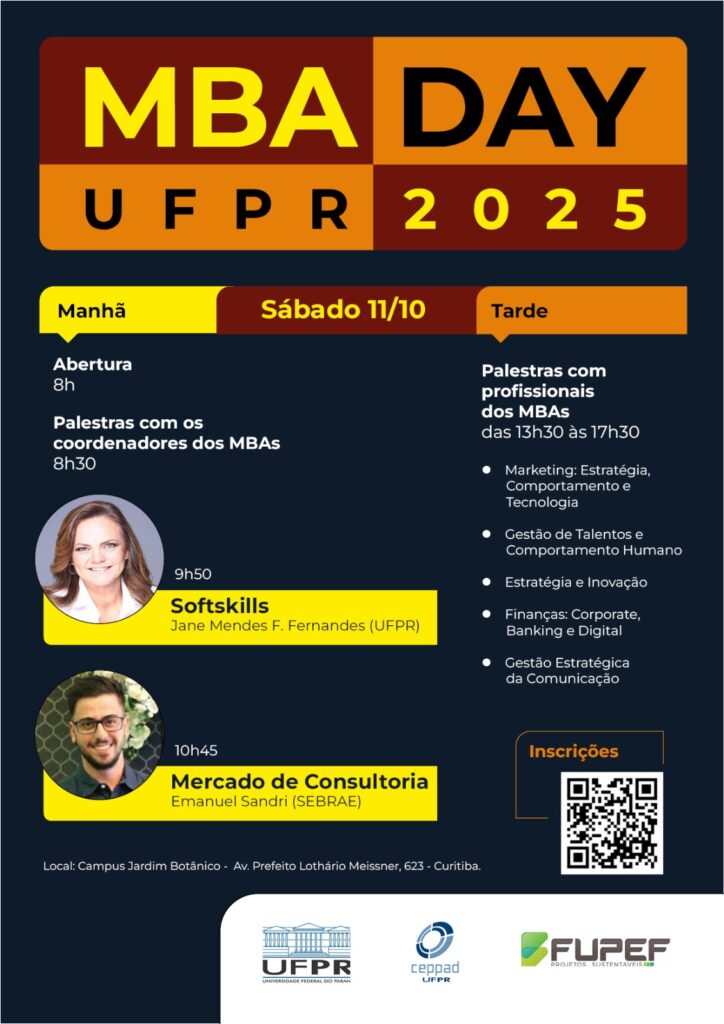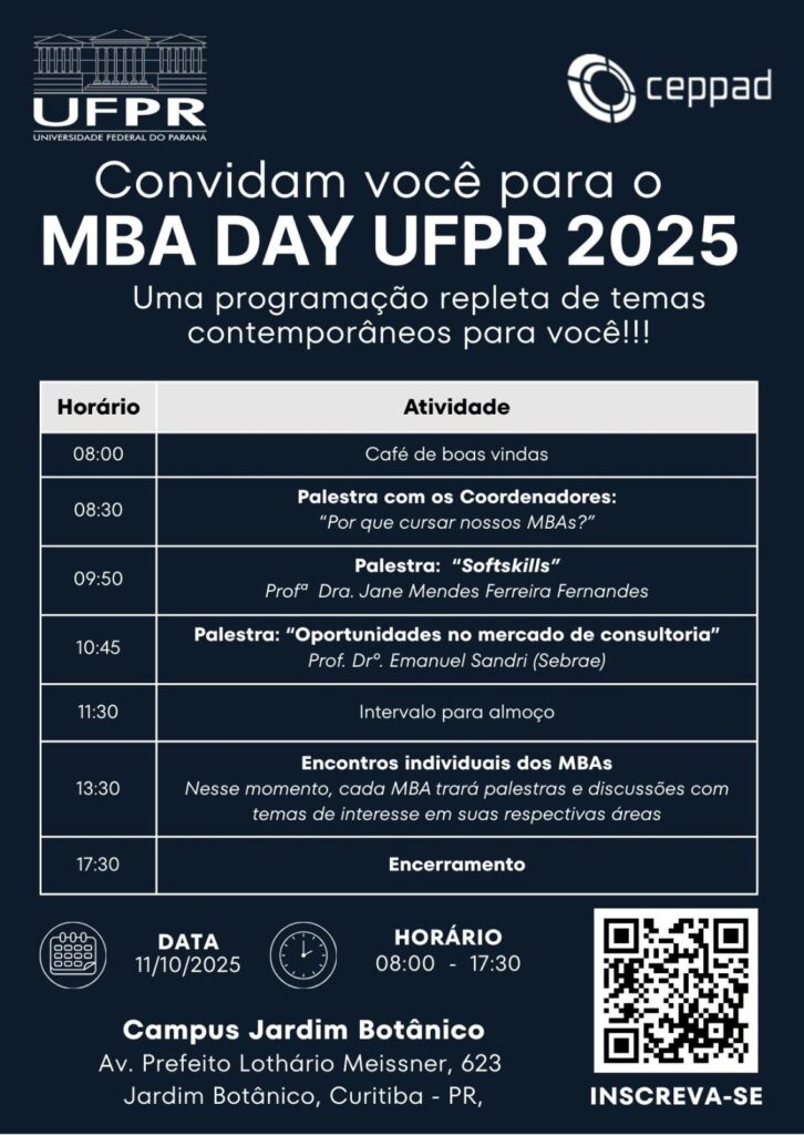 O Departamento de Administração da UFPR (Daga) promove, no dia 11 de outubro, o MBA Day 2025. O evento tem como objetivo reunir alunos e interessados em cursar especializações de MBA da instituição.