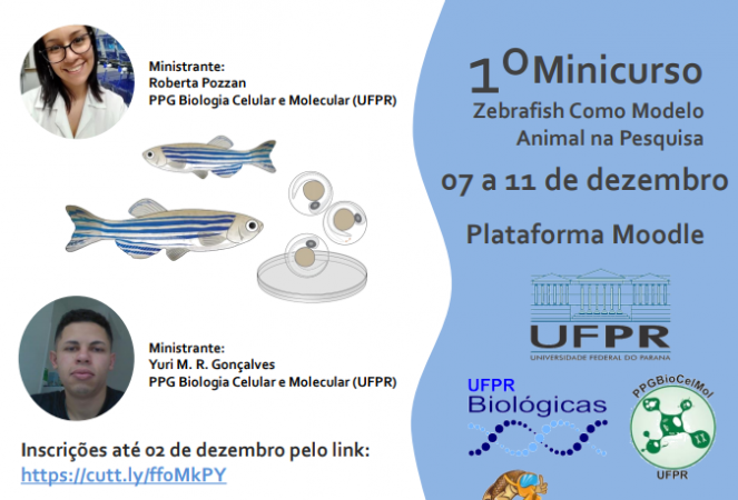 As inscrições estão abertas até o dia 2 de dezembro para o minicurso online “Zebrafish (Danio rerio) como modelo animal na pesquisa”, realizado por pesquisadores do Laboratório de Toxicologia Celular do Programa de Pós-Graduação em Biologia Celular e Molecular (PPGBiocel) da Universidade Federal do Paraná (UFPR).