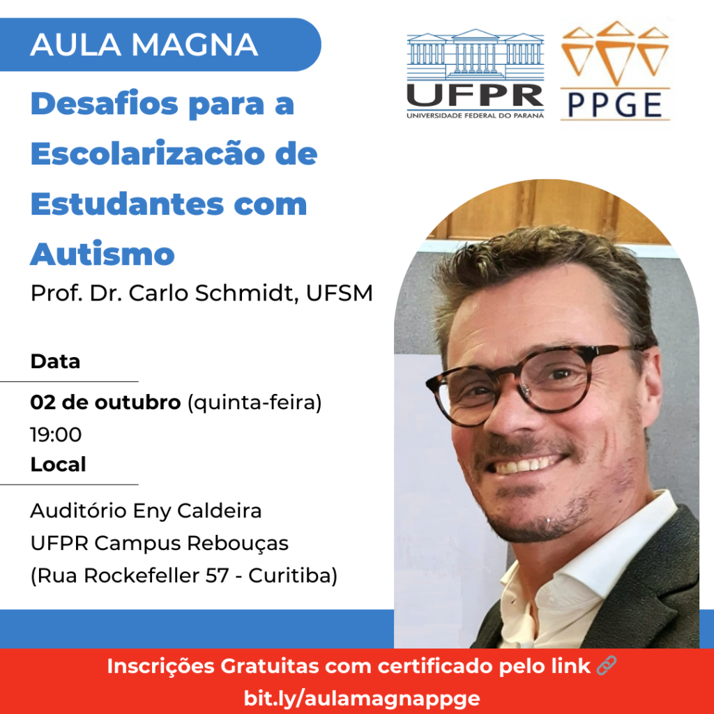 O Programa de Pós-Graduação em Educação (PPGE) da Universidade Federal do Paraná (UFPR) traz o Professor Associado da Universidade Federal de Santa Maria (UFSM), Líder do grupo de pesquisa em Educação Especial e Autismo (EdEA/CNPq) e Editor-Chefe da Revista Educação Especial, Carlo Schmidt, para a Aula Magna do segundo semestre letivo de 2025, intitulada “Desafios para a Escolarização de Estudantes com Autismo”. O evento acontece nesta quinta-feira (02/10) às 19h, no Auditório Eny Caldeira do Campus Rebouças da UFPR. As inscrições são gratuitas e geram certificado.