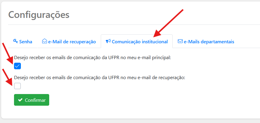 4 – Na tela de Configurações, clique sobre a opção Comunicação Institucional e marque as caixas de seleção desejadas (ou desmarque, para cancelar a inscrição). Em seguida, clique no botão Confirmar.