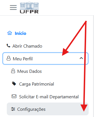 • No menu lateral esquerdo, clique em Meu Perfil, e em seguida, Solicitar E-mail Departamental