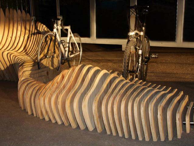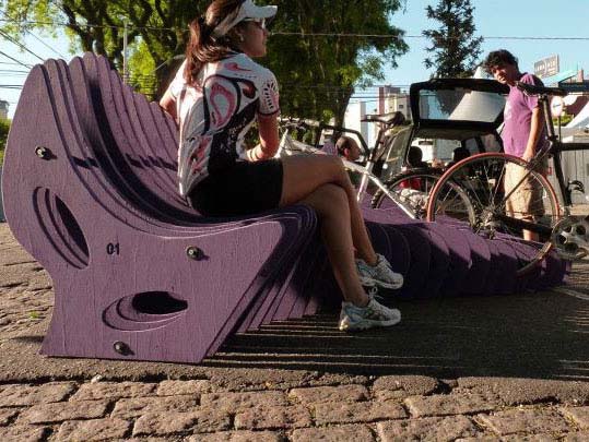 ‘Passamos por diversas ideias, desde um suporte onde fosse possível amarrar a bicicleta em vários lugares até o escolhido, que é um misto de banco com bicicletário’, comenta Rafael Fusco, um dos autores do projeto.