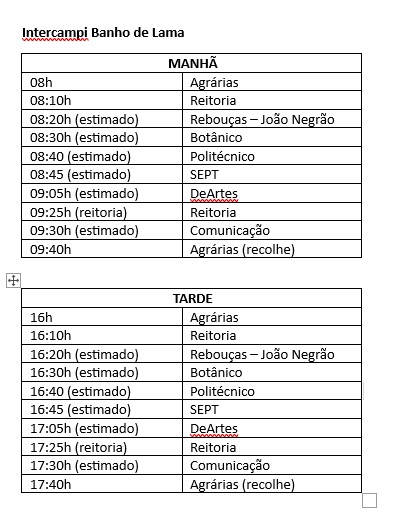 Para a comunidade da UFPR, o Restaurante Universitário (RU) Agrárias estará disponível das 11 horas às 13 horas. Já o Intercampi terá um horário de funcionamento especial para atender os estudantes que participarão do Banho de Lama. No campus Agrárias, os ônibus vão parar na Rua dos Funcionários, na parte externa do campus. Confira aqui o itinerário.