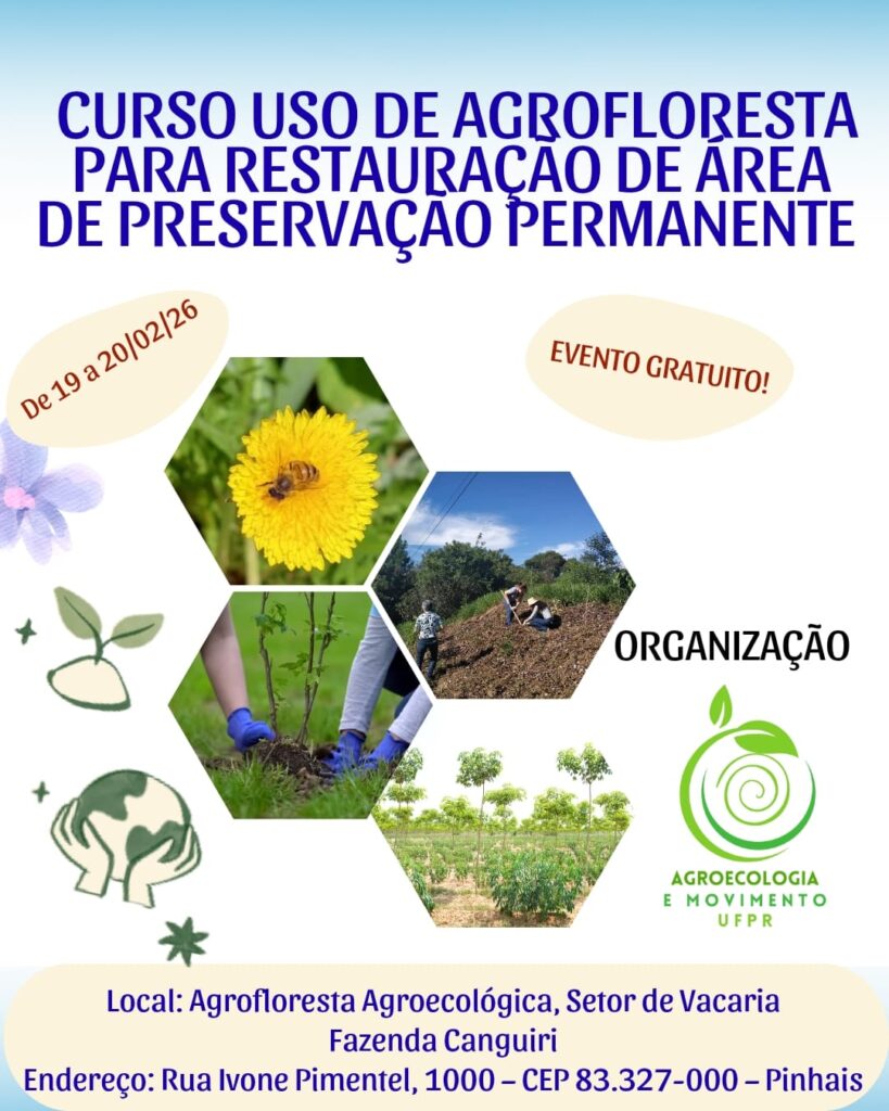 Recuperar áreas degradadas sem abrir mão da produção de alimentos pode parecer um paradoxo. Mas é justamente essa a proposta de um curso que será realizado nos dias 19 e 20 de fevereiro, na Fazenda Canguiri da Universidade Federal do Paraná (UFPR). A formação, com carga horária de 16 horas, aposta na integração entre práticas agroflorestais e as exigências do Código Florestal para transformar Áreas de Preservação Permanente (APP) em territórios de regeneração e abundância.