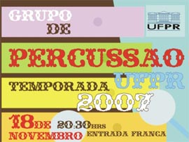 O Grupo de Percussão da UFPR faz o encerramento da temporada 2007 neste domingo, 18 de novembro, às 20h30, no Teatro da Reitoria (Rua XV de Novembro, 1299, Centro), apresentando músicas inéditas. A entrada é gratuita.