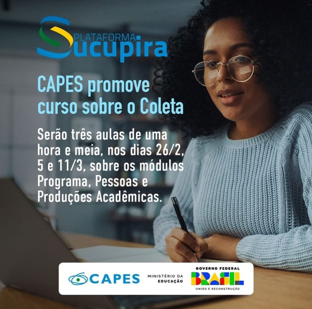 CAPES vai promover um curso para orientar os usuários da Plataforma Sucupira sobre o preenchimento da coleta de dados dos programas de pós-graduação. Serão três aulas de uma hora e meia, uma para cada módulo do Portal Coleta: Programa, na próxima segunda-feira, 26 de fevereiro, Pessoas, em 5 de março, e Produções Acadêmicas, no próximo dia 11.