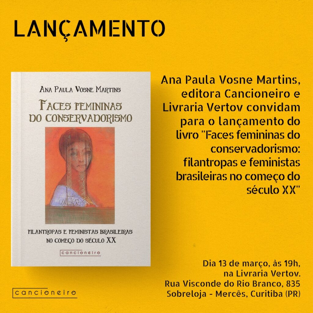 É com muita satisfação que o Programa da Pós-Graduação em História da UFPR, divulga e convida todos e todas para o lançamento do livro da Profa. Ana Paula Vosne Martins: “Faces Femininas do Conservadorismo: Filantropas e Feministas Brasileiras no Começo do Século XX”.