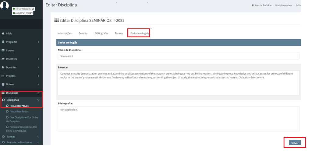 1. Acessar o menu disciplinas>visualizar ativas, clicar no nome da disciplina e depois na aba “dados em inglês”;
