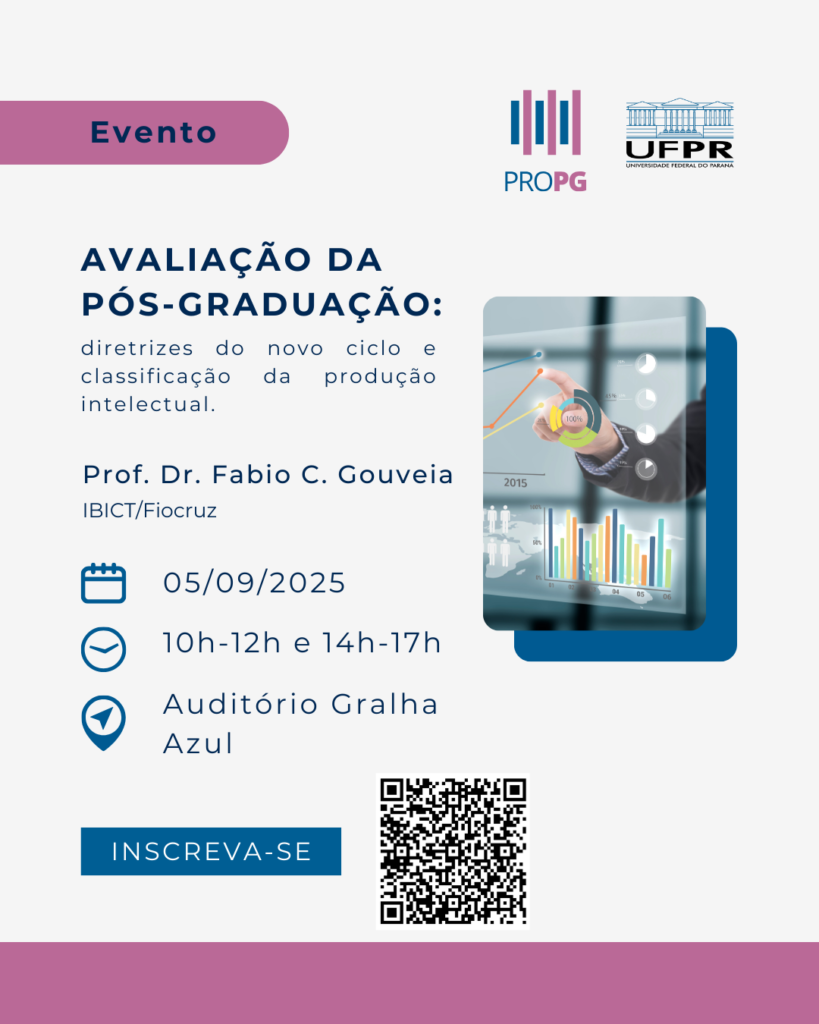 A Pró-Reitoria de Pós-Graduação da UFPR (PROPG), por meio da Coordenadoria de Pós-Graduação Stricto Sensu (CPGSS), realiza em 05 de setembro de 2025 o evento de extensão “Avaliação da Pós-Graduação: Diretrizes do Novo Ciclo e Classificação da Produção Intelectual”, como parte da série Café com Sucupira. A iniciativa tem como propósito fortalecer os Programas de Pós-Graduação diante dos novos desafios do novo ciclo de avaliação da CAPES.