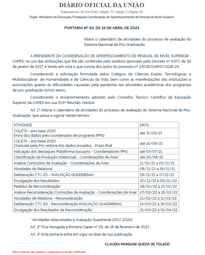 PORTARIA Nº 63, DE 16 DE ABRIL DE 2021 – PORTARIA Nº 63, DE 16 DE ABRIL DE 2021 – DOU – Imprensa Nacional (in.gov.br)