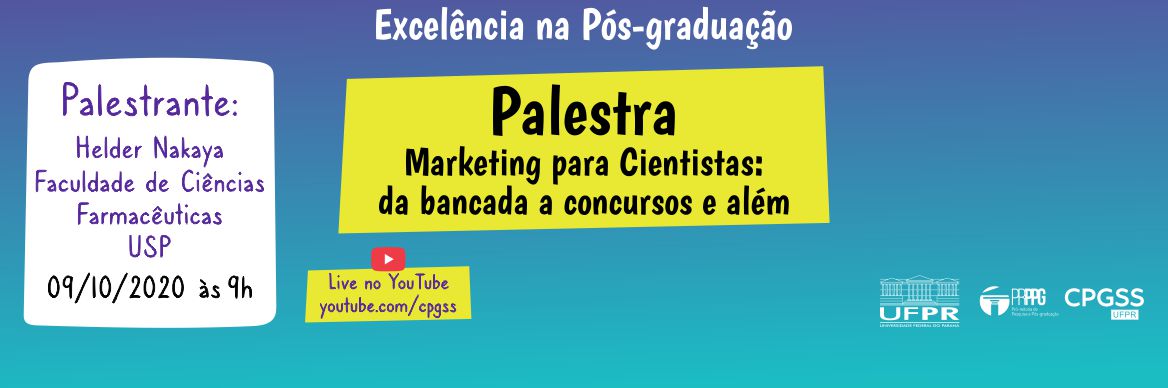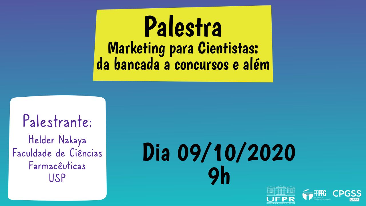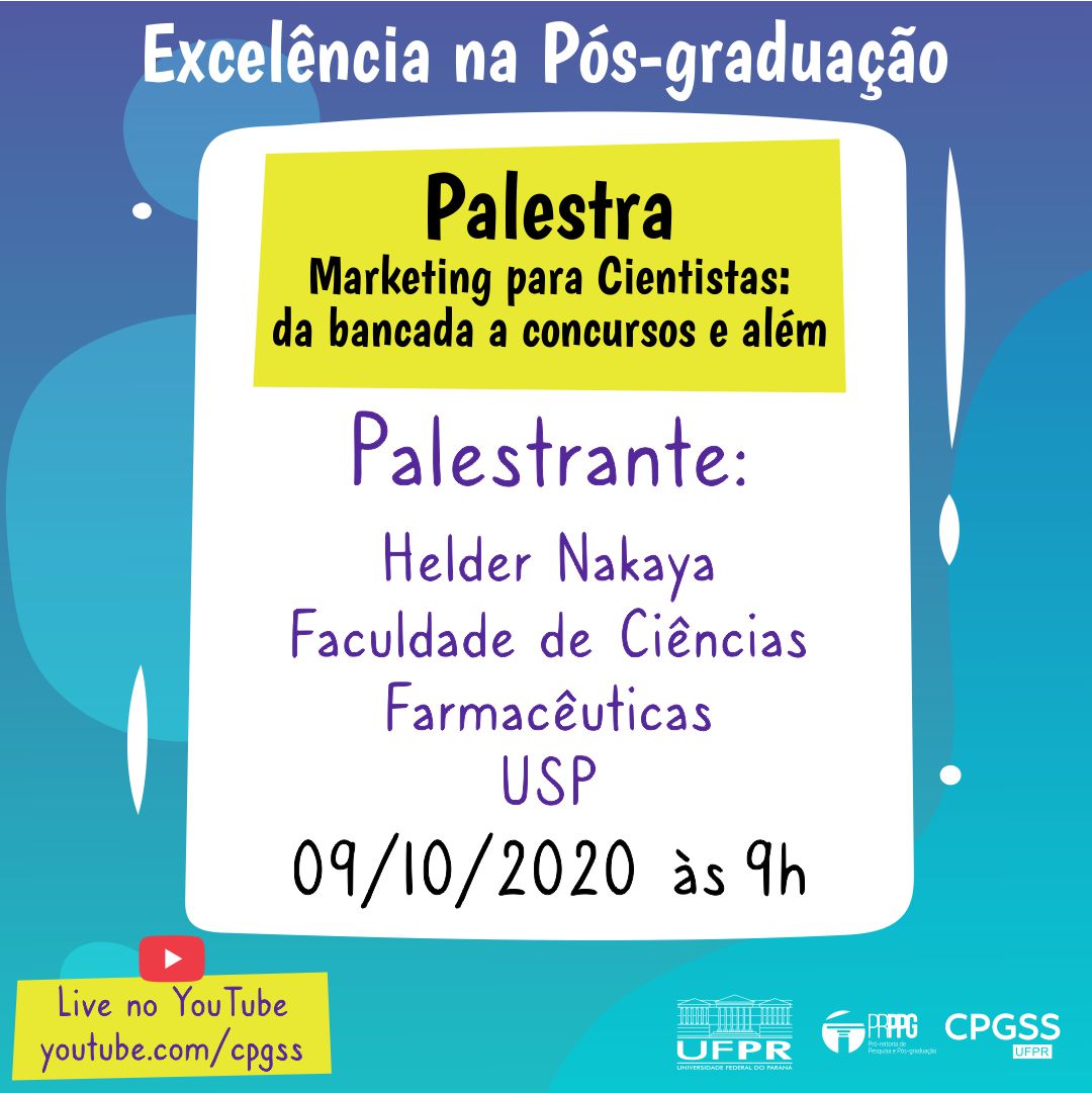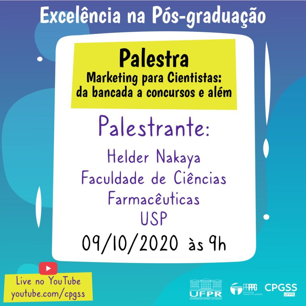 09/10/2020Palestra: Marketing para cientistas: da bancada a concursos e alémHelder Nakaya – Faculdade de Ciências Farmacêuticas – USP