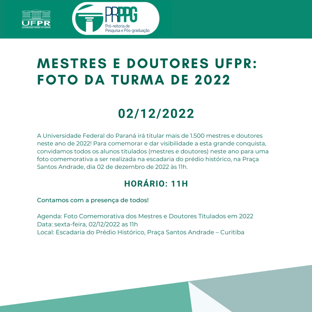 A Universidade Federal do Paraná irá titular mais de 1.500 mestres e doutores neste ano de 2022! Para comemorar e dar visibilidade a esta grande conquista, convidamos todos os alunos titulados (mestres e doutores) neste ano para uma foto comemorativa a ser realizada na escadaria do prédio histórico, na Praça Santos Andrade, dia 02 de dezembro de 2022 às 11h.