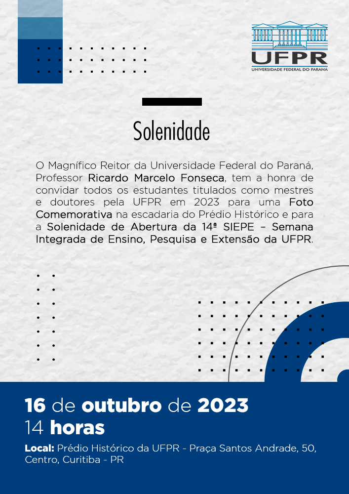 O Magnífico Reitor da Universidade Federal do Paraná, Professor Ricardo Marcelo Fonseca, tem a honra de convidar todos os estudantes titulados como mestres e doutores pela UFPR em 2023 para uma Foto Comemorativa na escadaria do Prédio Histórico e para a Solenidade de Abertura da 14ª SIEPE – Semana Integrada de Ensino, Pesquisa e Extensão da UFPR.