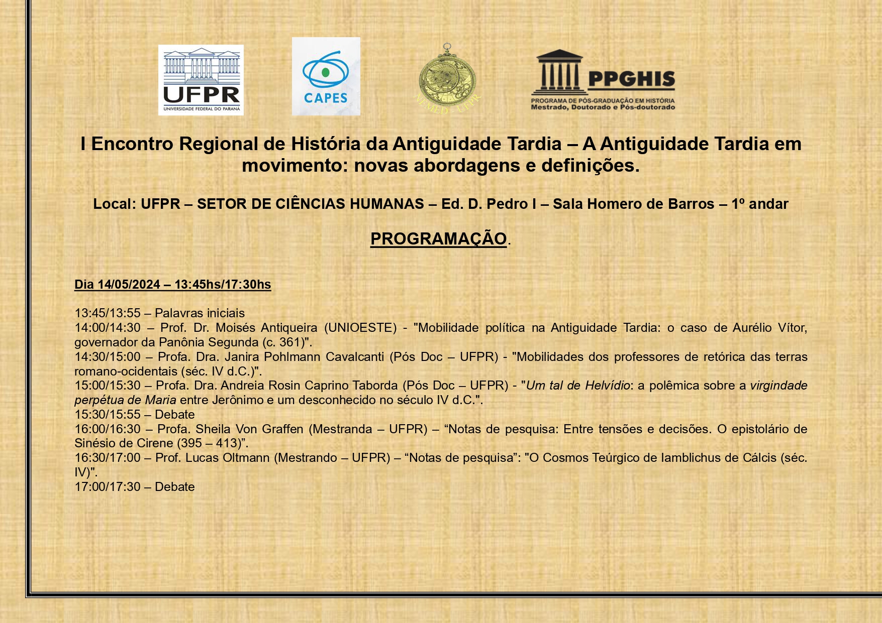 O Programa de Pós-Graduação em História (PPGHIS), juntamente com o Prof. Renan Frighetto, membro docente do programa, tem o prazer de divulgar e convidar a todos para o “I Encontro Regional de História da Antiguidade Tardia – A Antiguidade Tardia em movimento: novas abordagens e definições”, que ocorrerá nos dias 14, 15 e 16 de maio de 2024.