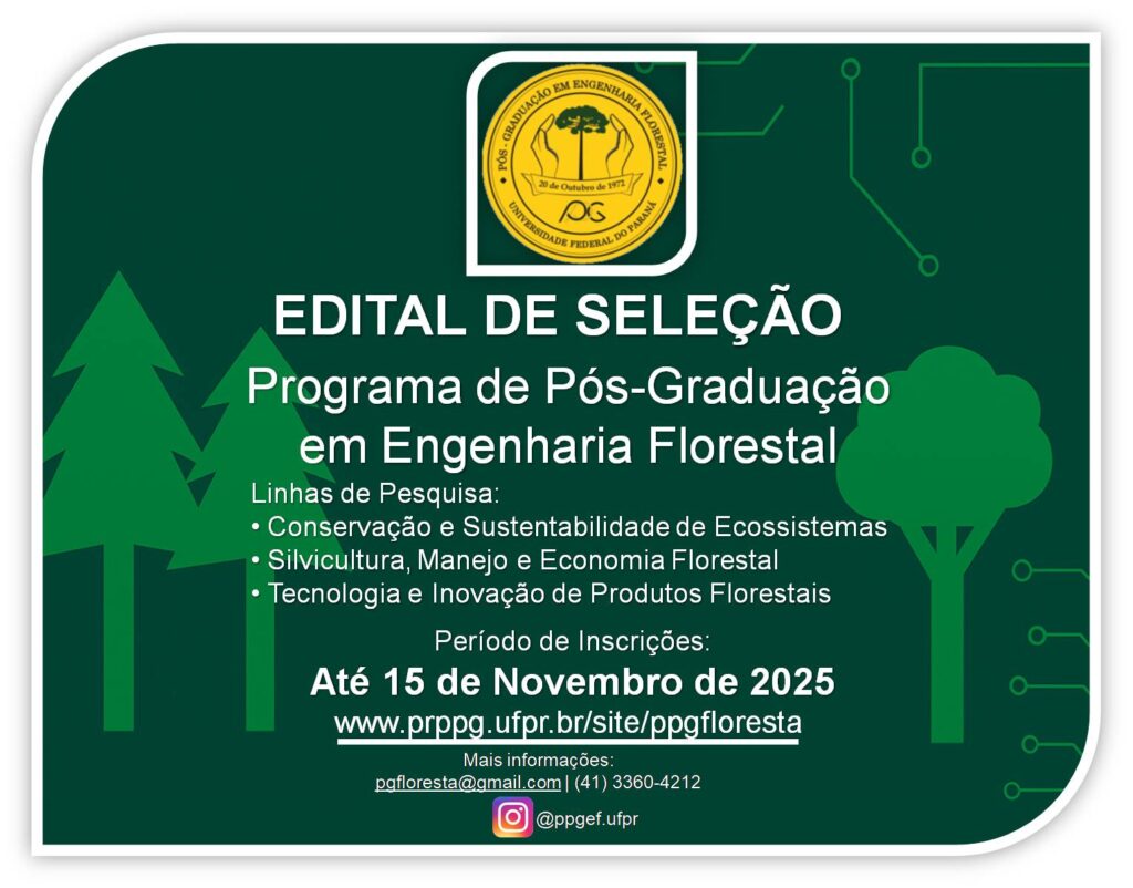 O Programa de Pós-Graduação em Engenharia Florestal (PPGEF) da Universidade Federal do Paraná (UFPR) anuncia a abertura do processo seletivo para ingresso em março de 2026, nos cursos de Mestrado Acadêmico e Doutorado.