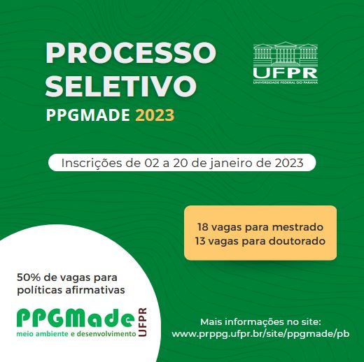 As inscrições estarão abertas de 02/01/2023 até 20/01/2023. Mais informações em: https://www.prppg.ufpr.br/site/ppgmade