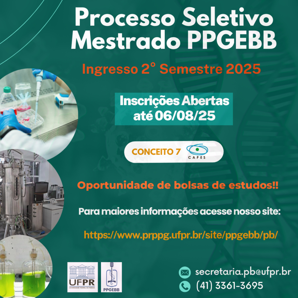 Estão abertas, até o dia 6 de agosto de 2025, as inscrições para o processo seletivo do curso de Mestrado em Engenharia de Bioprocessos e Biotecnologia da UFPR, com ingresso no 2º semestre de 2025.