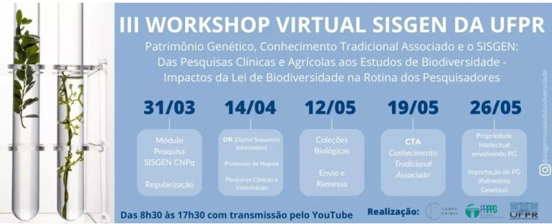 Inscrições: https://www.even3.com.br/iii-workshop-virtual-sisgen-da-ufpr-313987/