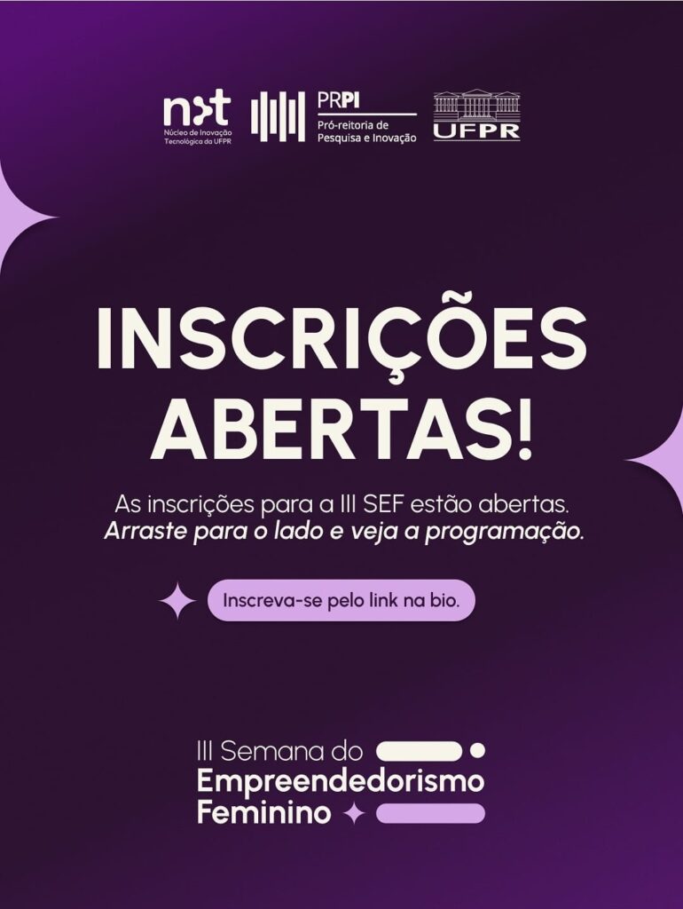 Link para inscrições: https://www.sympla.com.br/evento/iii-semana-do-empreendedorismo-feminino-da-ufpr/3183259