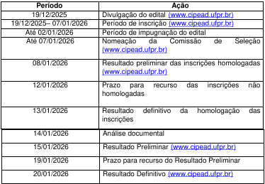 A Universidade Federal do Paraná – (UFPR), Instituição de Ensino Superior integrante do Sistema Federal de Ensino, participante do programa de formação a distância instituído pelo Ministério da Educação/MEC para a oferta do ensino superior gratuito e de qualidade no Brasil, torna pública a seleção de Professores para atuarem nos cursos do Sistema Universidade Aberta do Brasil (UAB) da UFPR, oferecidos com o apoio da Superintendência de Educação a Distância e Inovações Pedagógicas (SEaDIP/UFPR), em conformidade com a Portaria CAPES nº 309, de 27 de setembro de 2024.