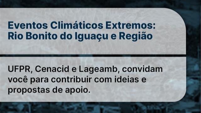 A Universidade Federal do Paraná (UFPR), o Centro de Apoio Científico em Desastres (Cenacid) e o Laboratório de Geoprocessamento e Estudos Ambientais (Lageamb) convidam a comunidade universitária para um encontro de troca de ideias e construção conjunta de propostas de apoio à população de Rio Bonito do Iguaçu, município fortemente atingido por um tornado no início deste mês. O evento será realizado na próxima quarta-feira (26), de forma on-line, às 16h.