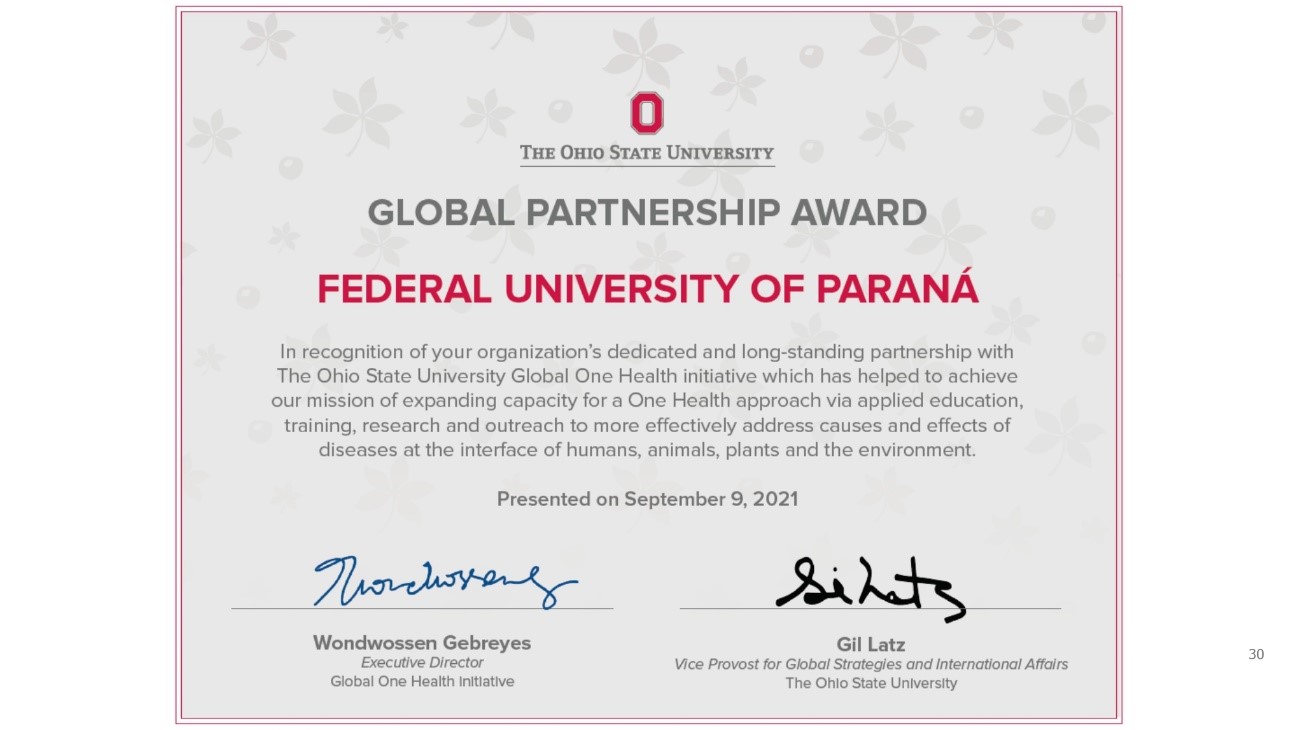 A Universidade Federal do Paraná (UFPR) conquistou, no dia 9 de setembro, o prêmio Global Partnership Award, promovido pela Global One Health initiative (GOHi). Desde 2014, a instituição integra o comitê organizador do Congresso Internacional de Patógenos na Interface Humana-Animal (Internacional Congresso on Pathogens and the Human-Animal Interface – ICOPHAI), cuja próxima edição será realizada na França em 2022.